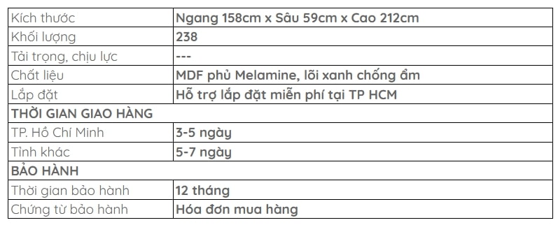 Sử dụng ván MDF chống ẩm phủ Melamine, sản phẩm mang lại sự bền bỉ, dễ dàng vệ sinh và chống lại tác động từ môi trường. Vật liệu này không chỉ giúp sản phẩm giữ được vẻ đẹp lâu dài mà còn đảm bảo sự an toàn và tiện ích trong suốt quá trình sử dụng.