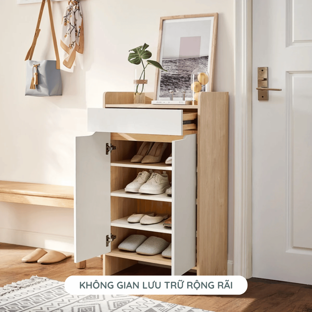Một điểm nổi bật khác của kệ giày TG02 là thiết kế thông minh với các phân vùng lưu trữ riêng biệt, phù hợp với nhiều loại giày dép có kích thước khác nhau. Điều này giúp người dùng dễ dàng sắp xếp và tổ chức giày dép một cách khoa học, gọn gàng. Ngoài ra, sản phẩm còn tích hợp thêm ngăn kéo tiện lợi để lưu trữ các đồ dùng nhỏ như chìa khóa, túi xách hoặc phụ kiện, giúp bạn dễ dàng lấy đồ khi cần.