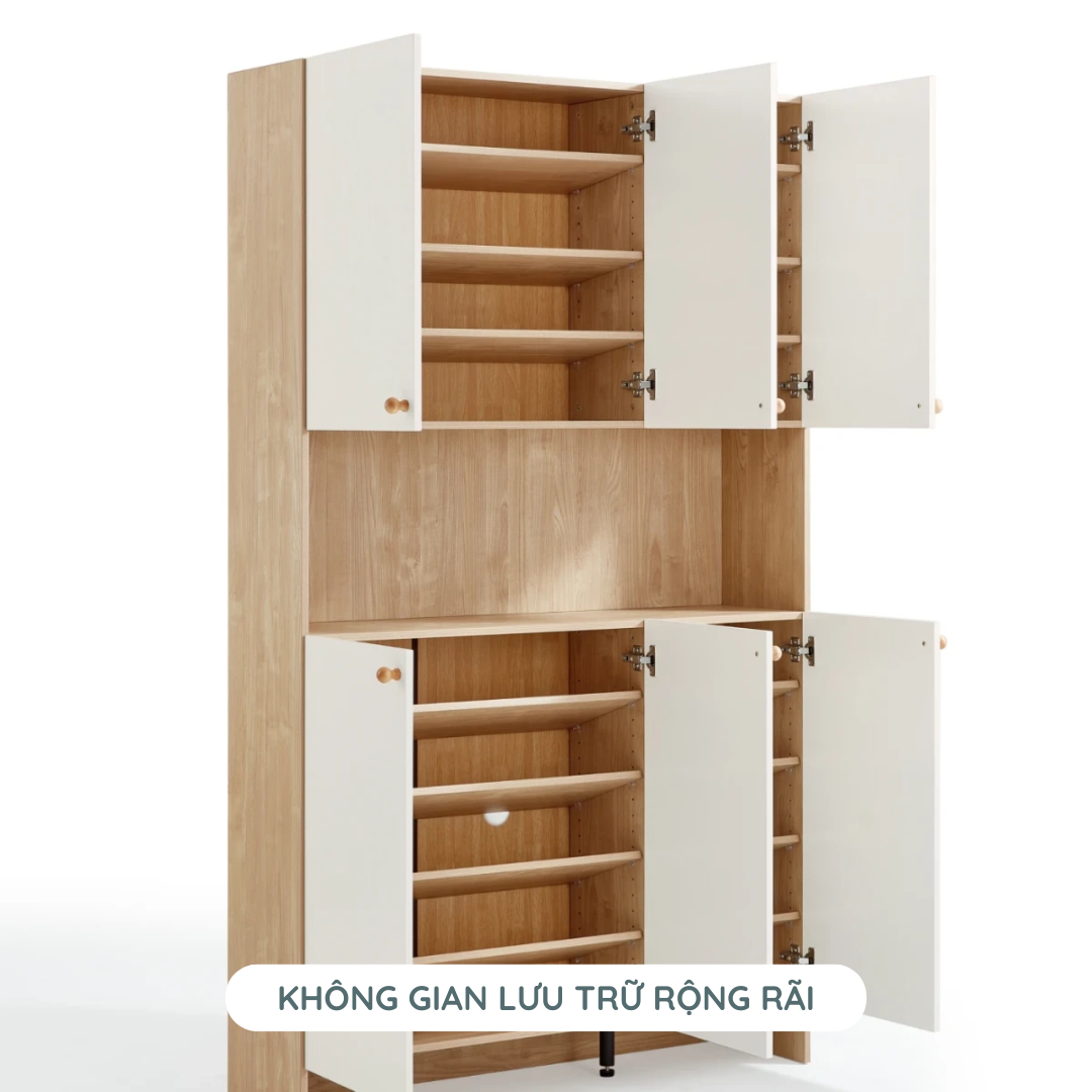 Với nhiều ngăn và kệ được bố trí hợp lý, tủ giày TG03 giúp tối ưu hóa không gian lưu trữ. Bạn có thể dễ dàng sắp xếp các loại giày dép với kích thước khác nhau và các vật dụng cá nhân như túi xách, phụ kiện. Điều này không chỉ giúp nhà cửa gọn gàng hơn mà còn giúp tiết kiệm không gian hiệu quả.