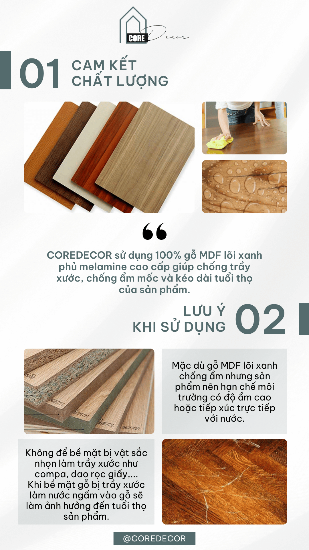- Bảo quản trong môi trường khô thoáng: Coredecor khuyến cáo mọi người nên đặt tủ ở nơi khô ráo, tránh tiếp xúc trực tiếp với nước để kéo dài tuổi thọ sản phẩm.